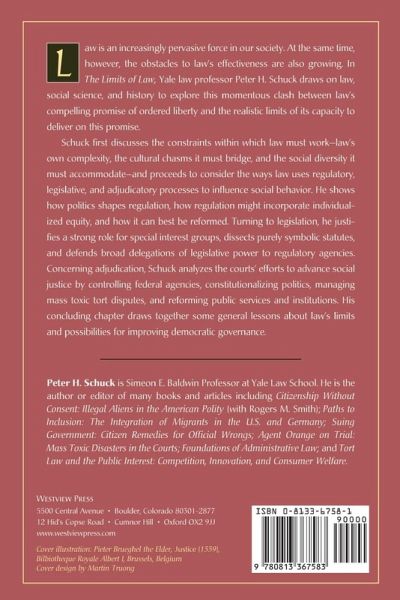 Law is an increasingly pervasive force in our society. At the same time, however, the obstacles to law's effectiveness are also growing. In The limits of Law, Yale law professor Peter H, Schuck draws on law, social science, and history to explore this momentous clash between law's compelling promise of ordered liberty and the realistic limits of its capacity to deliver on this promise. Schuck first discusses the constraints within which law must work-law's own complexity, the cultural chasms it must bridge, and the social diversity it must accommodate-and proceeds to consider the ways law uses regulatory, legislative, and adjudicatory processes to influence social behavior. He shows how politics shapes regulation, how regulation might incorporate individualized equity, and how it can best be reformed. Turning to legislation, he justifies a strong role for special interest groups, dissects purely symbolic statutes, and defends broad delegations of legislative power to regulatory agencies. Concerning adjudication, Schuck analyzes the courts' efforts to advance social justice by controlling federal agencies, constitutionalizing politics, managing mass toxic tort disputes, and reforming public services and institutions. His concluding chapter draws together some general lessons about law's limits and possibilities for improving democratic governance.