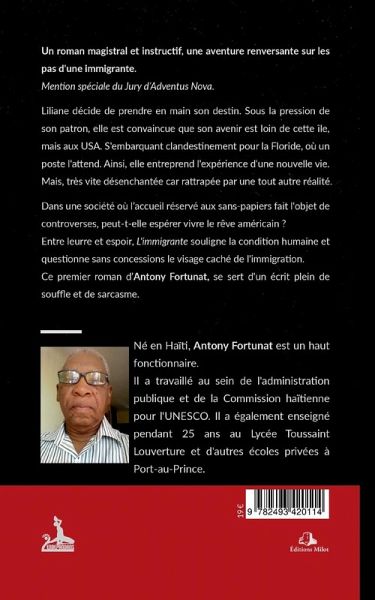 Un roman magistral et instructif, une aventure renversante sur les pas d'une immigrante. Mention spéciale du Jury d'Adventus Nova Liliane décide de prendre en main son destin. Sous la pression de son patron, elle est convaincue que son avenir est loin de cette île, mais aux USA. S'embarquant clandestinement pour la Floride, où un poste l'attend. Ainsi, elle entreprend l'expérience d'une nouvelle vie. Mais, très vite désenchantée, car rattrapée par une tout autre réalité. Dans une société ou l'accueil réservé aux sans-papiers fait l'objet de controverses, peut-elle espérer vivre le rêve américain ? Entre leurre et espoir, L'immigrante souligne la condition humaine et questionne sans concessions le visage caché de l'immigration. Ce premier roman d'Antony Fortunat, se sert d'un écrit plein de souffle et de sarcasme.