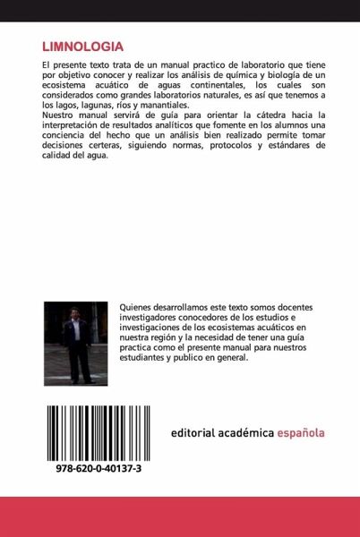 El presente texto trata de un manual practico de laboratorio que tiene por objetivo conocer y realizar los análisis de química y biología de un ecosistema acuático de aguas continentales, los cuales son considerados como grandes laboratorios naturales, es así que tenemos a los lagos, lagunas, ríos y manantiales. Nuestro manual servirá de guía para orientar la cátedra hacia la interpretación de resultados analíticos que fomente en los alumnos una conciencia del hecho que un análisis bien realizado permite tomar decisiones certeras, siguiendo normas, protocolos y estándares de calidad del agua.