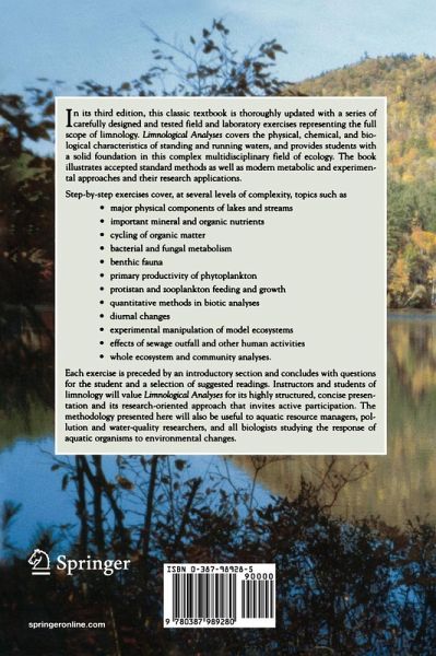 In this thoroughly updated third edition, the authors provide a series of carefully designed and tested field and laboratory exercises that represent the full scope of limnology. In using the text, students will gain a solid foundation in this complex, multidisciplinary field of ecology as they explore the physical, chemical, and biological characteristics of standing and running waters. The book illustrates accepted standard methods as well as modern metabolic and experimental approaches and their research applications. Each exercise is preceded by an introductory section and concludes with questions for students as well as suggestions for further reading. As a textbook, this is a highly structured, concise presentation with a research-oriented approach that openly invites active participation by students.