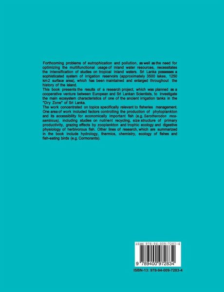 1. The Parakrama Samudra Project - scope and objectives,.- 2. Energy and water budget of a tropical man-made lake,.- 3. Thermal stratification, mixis and advective currents in the Parakrama Samudra Reservoir, Sri Lanka,.- 4. Phosphorus and phosphatase dynamics in Parakrama Samudra based on diurnal observations,.- 5. An assessment of the phytoplankton biomass and primary productivity of Parakrama Samudra, a shallow man-made lake in Sri Lanka,.- 6. Some remarks on long-term and seasonal changes in the zooplankton of Parakrama Samudra,.- 7. The composition, density and distribution of the zooplankton in Parakrama Samudra,.- 8. A diurnal study of the planktonic rotifer populations in Parakrama Samudra Reservoir, Sri Lanka,.- 9. The influence of temperature upon the duration of embryonic development of tropical Brachionus species (Rotifera),.- 10. Feeding studies with natural food particles on tropical species of planktonic rotifers,.- 11. Sediment characteristics and benthic community oxygen uptake rates in Parakrama Samudra, an ancient man-made lake in Sri Lanka,.- 12. A contribution to the ecology of the fish fauna of the Parakrama Samudra Reservoir.- 13. Feeding ecology, assimilation efficiencies and energetics of two herbivorous fish: Sarotherodon (Tilapia) mossambicus (Peters) and Puntius filamentosus (Cuv. et Val.),.- 14. Aspects of gut passage of algal cells in Sarotherodon mossambicus (Peters), (Pisces, Cichlidae),.- 15. Contributions to the functional anatomy of the feeding apparatus of five cyprinids of Parakrama Samudra (Sri Lanka),.- 16. Changes in body condition and proximate composition with maturation in Puntius sarana and Sarotherodon mossambicus,.- 17. Reproductive strategies of some major fish species in Parakrama Samudra Reservoir and their possibleimpact on the ecosystem - a theoretical consideration,.- 18. The ecology of cormorants (genus Phalacrocorax),.- 19. Parakrama Samudra Project - a summary of main results,.- Floristic and faunistic surveys.- 20. A contribution to the phytoplankton species composition of Parakrama Samudra, an ancient man-made lake in Sri Lanka,.- 21. Caddisflies (Trichoptera) from Parakrama Samudra, an ancient man-made lake in Sri Lanka,.- Species index.