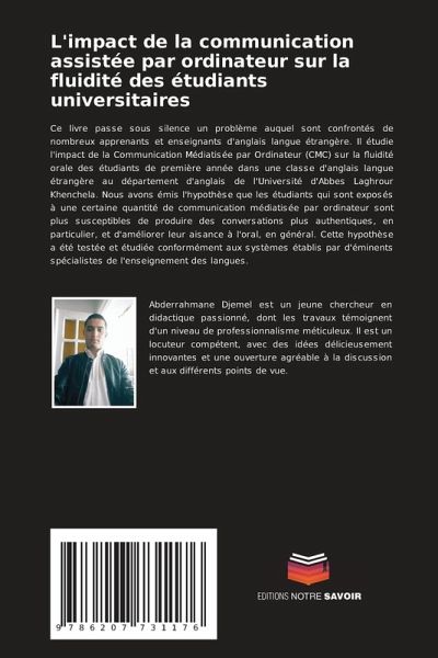 Ce livre passe sous silence un problème auquel sont confrontés de nombreux apprenants et enseignants d'anglais langue étrangère. Il étudie l'impact de la Communication Médiatisée par Ordinateur (CMC) sur la fluidité orale des étudiants de première année dans une classe d'anglais langue étrangère au département d'anglais de l'Université d'Abbes Laghrour Khenchela. Nous avons émis l'hypothèse que les étudiants qui sont exposés à une certaine quantité de communication médiatisée par ordinateur sont plus susceptibles de produire des conversations plus authentiques, en particulier, et d'améliorer leur aisance à l'oral, en général. Cette hypothèse a été testée et étudiée conformément aux systèmes établis par d'éminents spécialistes de l'enseignement des langues.