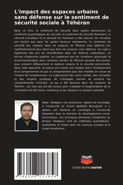 Dans ce livre, le sentiment de sécurité dans quatre dimensions (le sentiment psychologique de sécurité, le sentiment de sécurité financière, la sécurité somatique et la sécurité de l'honneur) a été mesuré, les résultats ont montré que dans les quatre facteurs mentionnés, le sentiment de sécurité des citoyens dans les espaces de Téhéran avec défense est significativement plus élevé que dans les espaces sans défense. Ce sujet a également été pris en considération dans les théories explicatives, en termes d'approche spatiale, en supposant que les conditions physiques et environnementales dans certaines parties de Téhéran peuvent être prises pour prévenir efficacement la violence urbaine et la sécurité personnelle. Dans cette approche, on pense qu'il existe une relation entre l'emplacement et le comportement et que le comportement peut être modifié en raison de l'impact de l'emplacement. La suppression des coins cachés, des cachettes et des moyens pratiques de s'échapper permet de prévenir les comportements criminels, ce qui a été observé dans les espaces de Téhéran ; les lieux qui ont été conçus pour s'adapter à l'augmentation de la criminalité ont été moins nombreux et les citoyens se sentent satisfaits.