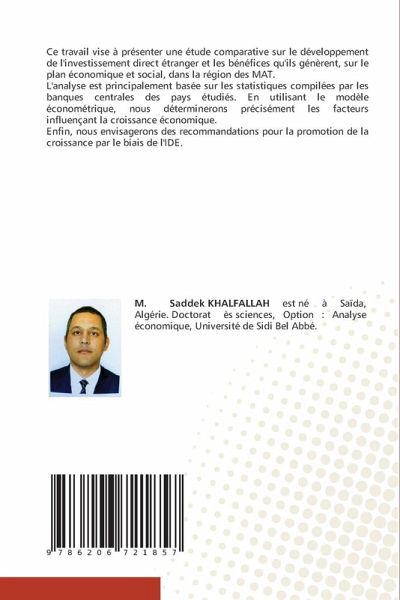 Ce travail vise à présenter une étude comparative sur le développement de l'investissement direct étranger et les bénéfices qu'ils génèrent, sur le plan économique et social, dans la région des MAT.L'analyse est principalement basée sur les statistiques compilées par les banques centrales des pays étudiés. En utilisant le modèle économétrique, nous déterminerons précisément les facteurs influençant la croissance économique.Enfin, nous envisagerons des recommandations pour la promotion de la croissance par le biais de l'IDE.