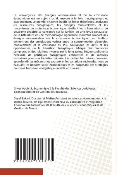 La convergence des énergies renouvelables et de la croissance économique est un sujet crucial, exploré à la fois théoriquement et pratiquement. Le premier chapitre établit les bases théoriques, analysant les ressources énergétiques, les énergies renouvelables et les mécanismes de croissance économique, révélant leurs liens étroits. Le deuxième chapitre se concentre sur la Tunisie, où une revue exhaustive de la littérature et une méthodologie rigoureuse montrent l'impact des énergies renouvelables sur la croissance économique. Les résultats démontrent des corrélations variées entre la consommation d'énergies renouvelables et la croissance du PIB, soulignant les défis et les opportunités de la transition énergétique. Malgré des tendances complexes et des relations inverses sur le long terme, l'étude souligne la nécessité de politiques énergétiques cohérentes et de mesures incitatives pour une transition réussie. Les recherches futures devraient approfondir les mécanismes causaux et les variations régionales, tout en évaluant les impacts socio-économiques et en proposant des stratégies pour une transition énergétique durable en Tunisie.