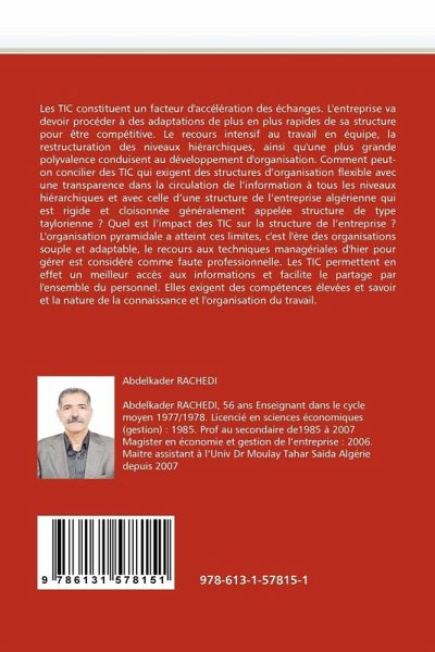 Les TIC constituent un facteur d'accélération des échanges. L'entreprise va devoir procéder à des adaptations de plus en plus rapides de sa structure pour être compétitive. Le recours intensif au travail en équipe, la restructuration des niveaux hiérarchiques, ainsi qu'une plus grande polyvalence conduisent au développement d'organisation. Comment peut-on concilier des TIC qui exigent des structures d'organisation flexible avec une transparence dans la circulation de l'information à tous les niveaux hiérarchiques et avec celle d'une structure de l'entreprise algérienne qui est rigide et cloisonnée généralement appelée structure de type taylorienne ? Quel est l'impact des TIC sur la structure de l'entreprise ? L'organisation pyramidale a atteint ces limites, c'est l'ère des organisations souple et adaptable, le recours aux techniques managériales d'hier pour gérer est considéré comme faute professionnelle. Les TIC permettent en effet un meilleur accès aux informations et facilite le partage par l'ensemble du personnel. Elles exigent des compétences élevées et savoir et la nature de la connaissance et l'organisation du travail.
