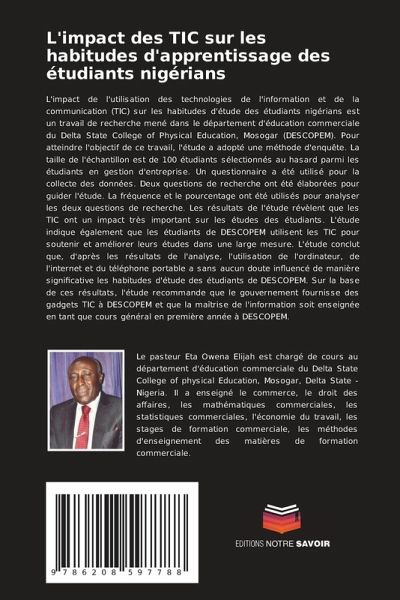 L'impact de l'utilisation des technologies de l'information et de la communication (TIC) sur les habitudes d'étude des étudiants nigérians est un travail de recherche mené dans le département d'éducation commerciale du Delta State College of Physical Education, Mosogar (DESCOPEM). Pour atteindre l'objectif de ce travail, l'étude a adopté une méthode d'enquête. La taille de l'échantillon est de 100 étudiants sélectionnés au hasard parmi les étudiants en gestion d'entreprise. Un questionnaire a été utilisé pour la collecte des données. Deux questions de recherche ont été élaborées pour guider l'étude. La fréquence et le pourcentage ont été utilisés pour analyser les deux questions de recherche. Les résultats de l'étude révèlent que les TIC ont un impact très important sur les études des étudiants. L'étude indique également que les étudiants de DESCOPEM utilisent les TIC pour soutenir et améliorer leurs études dans une large mesure. L'étude conclut que, d'après les résultats de l'analyse, l'utilisation de l'ordinateur, de l'internet et du téléphone portable a sans aucun doute influencé de manière significative les habitudes d'étude des étudiants de DESCOPEM. Sur la base de ces résultats, l'étude recommande que le gouvernement fournisse des gadgets TIC à DESCOPEM et que la maîtrise de l'information soit enseignée en tant que cours général en première année à DESCOPEM.