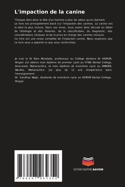 "Chaque dent dans la tête d'un homme a plus de valeur qu'un diamant.Le livre est principalement basé sur l'impaction des canines. La canine est la dent la plus incluse. Dans ces livres, nous avons donc discuté en détail de l'étiologie et des théories, de la classification, du diagnostic, des considérations cliniques et de la prise en charge des canines incluses. Ce livre est une revue complète de l'impaction canine. Nous espérons que ce livre vous a apporté ce que vous recherchiez.