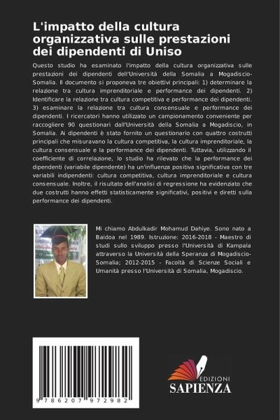 Questo studio ha esaminato l'impatto della cultura organizzativa sulle prestazioni dei dipendenti dell'Università della Somalia a Mogadiscio-Somalia. Il documento si proponeva tre obiettivi principali: 1) determinare la relazione tra cultura imprenditoriale e performance dei dipendenti. 2) Identificare la relazione tra cultura competitiva e performance dei dipendenti. 3) esaminare la relazione tra cultura consensuale e performance dei dipendenti. I ricercatori hanno utilizzato un campionamento conveniente per raccogliere 90 questionari dall'Università della Somalia a Mogadiscio, in Somalia. Ai dipendenti è stato fornito un questionario con quattro costrutti principali che misuravano la cultura competitiva, la cultura imprenditoriale, la cultura consensuale e la performance dei dipendenti. Tuttavia, utilizzando il coefficiente di correlazione, lo studio ha rilevato che la performance dei dipendenti (variabile dipendente) ha un'influenza positiva significativa con tre variabili indipendenti: cultura competitiva, cultura imprenditoriale e cultura consensuale. Inoltre, il risultato dell'analisi di regressione ha evidenziato che due costrutti hanno effetti statisticamente significativi, positivi e diretti sulla performance dei dipendenti.