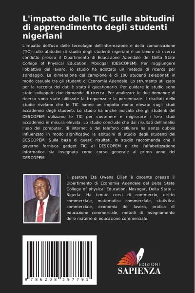 L'impatto dell'uso delle tecnologie dell'informazione e della comunicazione (TIC) sulle abitudini di studio degli studenti nigeriani è un lavoro di ricerca condotto presso il Dipartimento di Educazione Aziendale del Delta State College of Physical Education, Mosogar (DESCOPEM). Per raggiungere l'obiettivo del lavoro, lo studio ha adottato un metodo di ricerca per sondaggio. La dimensione del campione è di 100 studenti selezionati in modo casuale tra gli studenti di Economia Aziendale. Lo strumento utilizzato per la raccolta dei dati è stato il questionario. Per guidare lo studio sono state sviluppate due domande di ricerca. Per analizzare le due domande di ricerca sono state utilizzate la frequenza e la percentuale. I risultati dello studio rivelano che le TIC hanno un impatto molto elevato sugli studi accademici degli studenti. Lo studio ha anche indicato che gli studenti del DESCOPEM utilizzano le TIC per sostenere e migliorare i loro studi accademici in misura elevata. Lo studio conclude che dai risultati dell'analisi l'uso del computer, di internet e del telefono cellulare ha senza dubbio influenzato in modo significativo le abitudini di studio degli studenti del DESCOPEM. Sulla base di questi risultati, lo studio raccomanda che il governo fornisca gadget TIC al DESCOPEM e che l'alfabetizzazione informatica sia insegnata come corso generale al primo anno del DESCOPEM.