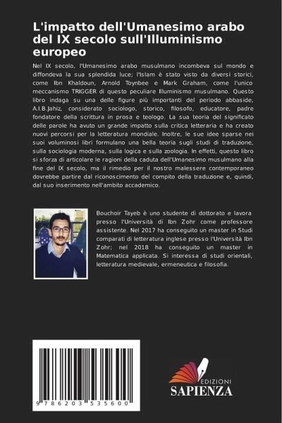 Nel IX secolo, l'Umanesimo arabo musulmano incombeva sul mondo e diffondeva la sua splendida luce; l'Islam è stato visto da diversi storici, come Ibn Khaldoun, Arnold Toynbee e Mark Graham, come l'unico meccanismo TRIGGER di questo peculiare Illuminismo musulmano. Questo libro indaga su una delle figure più importanti del periodo abbaside, A.I.B.Jahiz, considerato sociologo, storico, filosofo, educatore, padre fondatore della scrittura in prosa e teologo. La sua teoria del significato delle parole ha avuto un grande impatto sulla critica letteraria e ha creato nuovi percorsi per la letteratura mondiale. Inoltre, le sue idee sparse nei suoi voluminosi libri formulano una bella teoria sugli studi di traduzione, sulla sociologia moderna, sulla logica e sulla zoologia. In effetti, questo libro si sforza di articolare le ragioni della caduta dell'Umanesimo musulmano alla fine del IX secolo, ma il rimedio per il nostro malessere contemporaneo dovrebbe partire dal riconoscimento del compito della traduzione e, quindi, dal suo inserimento nell'ambito accademico.