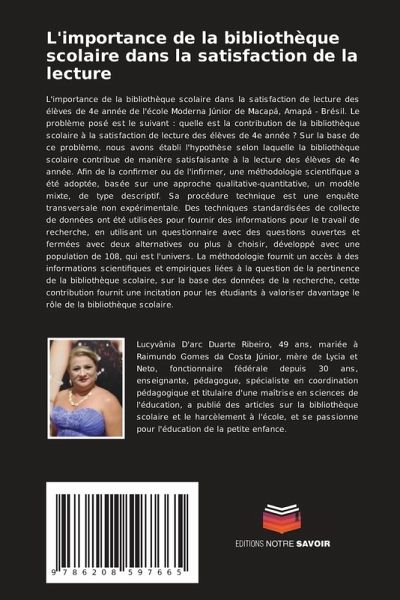 L'importance de la bibliothèque scolaire dans la satisfaction de lecture des élèves de 4e année de l'école Moderna Júnior de Macapá, Amapá - Brésil. Le problème posé est le suivant : quelle est la contribution de la bibliothèque scolaire à la satisfaction de lecture des élèves de 4e année ? Sur la base de ce problème, nous avons établi l'hypothèse selon laquelle la bibliothèque scolaire contribue de manière satisfaisante à la lecture des élèves de 4e année. Afin de la confirmer ou de l'infirmer, une méthodologie scientifique a été adoptée, basée sur une approche qualitative-quantitative, un modèle mixte, de type descriptif. Sa procédure technique est une enquête transversale non expérimentale. Des techniques standardisées de collecte de données ont été utilisées pour fournir des informations pour le travail de recherche, en utilisant un questionnaire avec des questions ouvertes et fermées avec deux alternatives ou plus à choisir, développé avec une population de 108, qui est l'univers. La méthodologie fournit un accès à des informations scientifiques et empiriques liées à la question de la pertinence de la bibliothèque scolaire, sur la base des données de la recherche, cette contribution fournit une incitation pour les étudiants à valoriser davantage le rôle de la bibliothèque scolaire.