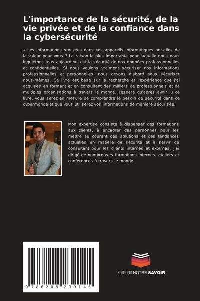 « Les informations stockées dans vos appareils informatiques ont-elles de la valeur pour vous ? La raison la plus importante pour laquelle nous nous inquiétons tous aujourd'hui est la sécurité de nos données professionnelles et confidentielles. Si nous voulons vraiment sécuriser nos informations professionnelles et personnelles, nous devons d'abord nous sécuriser nous-mêmes. Ce livre est basé sur la recherche et l'expérience que j'ai acquises en formant et en consultant des milliers de professionnels et de multiples organisations à travers le monde. J'espère qu'après avoir lu ce livre, vous serez en mesure de comprendre le besoin de sécurité dans ce cybermonde et que vous utiliserez vos informations de manière sécurisée.