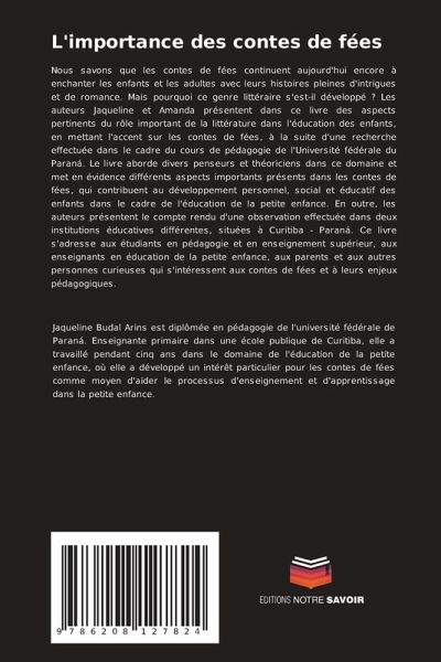 Nous savons que les contes de fées continuent aujourd'hui encore à enchanter les enfants et les adultes avec leurs histoires pleines d'intrigues et de romance. Mais pourquoi ce genre littéraire s'est-il développé ? Les auteurs Jaqueline et Amanda présentent dans ce livre des aspects pertinents du rôle important de la littérature dans l'éducation des enfants, en mettant l'accent sur les contes de fées, à la suite d'une recherche effectuée dans le cadre du cours de pédagogie de l'Université fédérale du Paraná. Le livre aborde divers penseurs et théoriciens dans ce domaine et met en évidence différents aspects importants présents dans les contes de fées, qui contribuent au développement personnel, social et éducatif des enfants dans le cadre de l'éducation de la petite enfance. En outre, les auteurs présentent le compte rendu d'une observation effectuée dans deux institutions éducatives différentes, situées à Curitiba - Paraná. Ce livre s'adresse aux étudiants en pédagogie et en enseignement supérieur, aux enseignants en éducation de la petite enfance, aux parents et aux autres personnes curieuses qui s'intéressent aux contes de fées et à leurs enjeux pédagogiques.