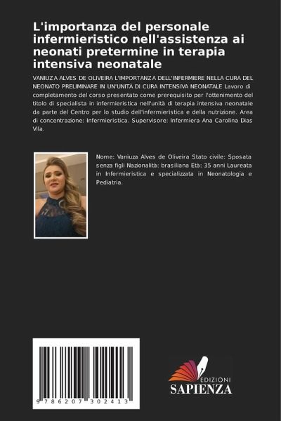 VANIUZA ALVES DE OLIVEIRA L'IMPORTANZA DELL'INFERMIERE NELLA CURA DEL NEONATO PRELIMINARE IN UN'UNITÀ DI CURA INTENSIVA NEONATALE Lavoro di completamento del corso presentato come prerequisito per l'ottenimento del titolo di specialista in infermieristica nell'unità di terapia intensiva neonatale da parte del Centro per lo studio dell'infermieristica e della nutrizione. Area di concentrazione: Infermieristica. Supervisore: Infermiera Ana Carolina Dias Vila.