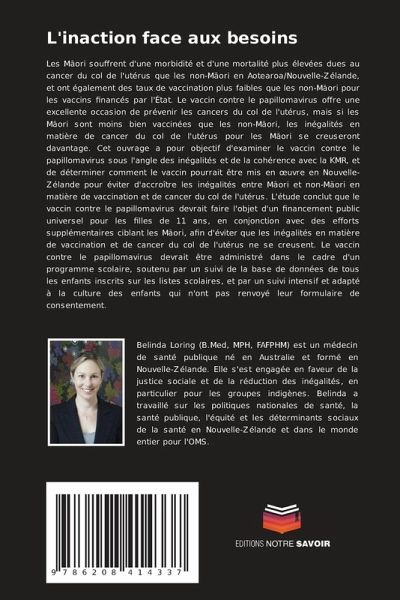 Les Maori souffrent d'une morbidité et d'une mortalité plus élevées dues au cancer du col de l'utérus que les non-Maori en Aotearoa/Nouvelle-Zélande, et ont également des taux de vaccination plus faibles que les non-Maori pour les vaccins financés par l'État. Le vaccin contre le papillomavirus offre une excellente occasion de prévenir les cancers du col de l'utérus, mais si les Maori sont moins bien vaccinées que les non-Maori, les inégalités en matière de cancer du col de l'utérus pour les Maori se creuseront davantage. Cet ouvrage a pour objectif d'examiner le vaccin contre le papillomavirus sous l'angle des inégalités et de la cohérence avec la KMR, et de déterminer comment le vaccin pourrait être mis en oeuvre en Nouvelle-Zélande pour éviter d'accroître les inégalités entre Maori et non-Maori en matière de vaccination et de cancer du col de l'utérus. L'étude conclut que le vaccin contre le papillomavirus devrait faire l'objet d'un financement public universel pour les filles de 11 ans, en conjonction avec des efforts supplémentaires ciblant les Maori, afin d'éviter que les inégalités en matière de vaccination et de cancer du col de l'utérus ne se creusent. Le vaccin contre le papillomavirus devrait être administré dans le cadre d'un programme scolaire, soutenu par un suivi de la base de données de tous les enfants inscrits sur les listes scolaires, et par un suivi intensif et adapté à la culture des enfants qui n'ont pas renvoyé leur formulaire de consentement.