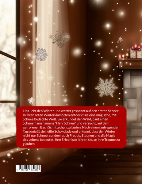 Lina liebt den Winter und wartet gespannt auf den ersten Schnee. In ihren roten Winterklamotten entdeckt sie eine magische, mit Schnee bedeckte Welt. Sie erkundet den Wald, baut einen Schneemann namens "Herr Schnee" und versucht, auf dem gefrorenen Bach Schlittschuh zu laufen. Nach einem aufregenden Tag genießt sie heiße Schokolade und erkennt, dass der Winter nicht nur Schnee, sondern auch Freude, Staunen und die Magie des Lebens bedeutet. Ihre Erlebnisse lehren sie, an ihre Traume zu glauben.