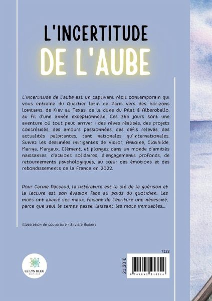 L¿incertitude de l¿aube est un captivant récit contemporain qui vous entraîne du Quartier latin de Paris vers des horizons lointains, de Kiev au Texas, de la dune du Pilat à Alberobello, au fil d¿une année exceptionnelle. Ces 365 jours sont une aventure où tout peut arriver : des rêves réalisés, des projets concrétisés, des amours passionnées, des défis relevés, des actualités palpitantes, tant nationales qüinternationales. Suivez les destinées intrigantes de Victor, Antoine, Clothilde, Mariya, Margaux, Clément, et plongez dans un monde d¿amitiés naissantes, d¿actions solidaires, d¿engagements profonds, de retournements psychologiques, au c¿ur des émotions et des rebondissements de la France en 2022.