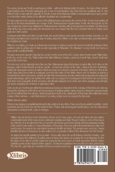 The drama Lincoln and Booth (a dual tragedy) retells—with some fictional detail, of course—the story of Abe Lincoln, a hardworking man of humble upbringing and a man of moral turpitude who shies from the egotistical, and of John Wilkes Booth, a man quite the opposite of Lincoln, a man of bombast and inflated moral principle based upon genetic or on bloodline vanity, leading to his ultimate dissolution and megalomania. The play spans from the opening scenes of the biblical ironies surrounding the advent of the Lincoln era in politics all the way to the final assassination and escape of the Shakespearean megalomaniac Booth, who throughout, by the way, employs his deluded and disillusioned Shakespearean reasoning with great epigonal or bombastic conclusiveness while all the way, irony surely plays him all around and ever onward into his mad conviction that he is Brutus come again and Dixie’s savior. In between both Wilkes and Abe is Edwin Booth, the great Northern actor (as his demented brother sees him, i.e., for his having formalized (too much) the style of acting away from Wilkes’ more wild, emotional style, generally labeled too Southern by Edwin. Wilkes is ever taking on Edwin as a threat and someone he wishes to prove the lesser for both the betrayal of their southern roots (in acting) and of Dixie as well, especially of "Maryland, Oh, Maryland" a song Booth ever hums or sings out like a political fanatic. The play ends not in Garrett’s Barn but (in a dream) on the deck of the USS Levant, where Booth meets Philip Nolan, in the fog, on the deck. Yes, Philip Nolan in the Man Without a Country, a book by Everett Hale, a book Booth had read in his recent days. The sets need not be elaborate since this one, like Shakespeare plays themselves, requires little, for it relies on the language, which Booth himself, as well as Lincoln—no less and admirer of the Bard—bring to the fore of attention, making all extravagant scenery an option. Most necessary as a set piece, however, is the large, full-body mirror in the center stage that serves both as a swinging door from the realm of one White House room to another, as well as a conduit into the other’s prescience (at first) and later full consciousness, and thru which both protagonist and antagonist speak unknowingly, right at one another, the while more so engaged in monologues to themselves and yet directing other lines more poignantly at their adversary, who likewise happens to be at his own mirror, prepping and primping and worse, imagining the ominous or oppressive other. Both Lincoln and Booth begin within their individual personas as characters in the real play of their lives and wind up, through the vicissitudes of the times and the pressures of political warfare, taking assumed characters (unconsciously and yet not without their true natures), which brought them both to the catastrophe of their tragic fates within this drama or play of their real lives—a fact that amazed me during or later on in my research for this work. William Vincent, author If there is any staging or adaptational interest in this script or in any others I have as yet been unable to publish, I wrote myself into poverty in the love and the belief in them. Please visit www.beggarmuse@ yahoo. com for a list and/or discussions or arrangements. Leave a message.