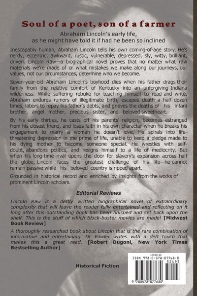 Experience the personal story of a man who changed the world. A melancholy poet weathers tragedy, abuse, and self-doubt to keep a sacred promise. Included in the Lincoln Collection of the Abraham Lincoln Presidential Library Abraham Lincoln is inescapably human, reliving the gauntlet of tragedy and abuse that should have consumed him, exposing his private reasons for standing firm on the brink of war. Seven-year-old Abraham Lincoln's boyhood dies when his father drags their family from the relative comfort of Kentucky into an unforgiving Indiana wilderness. While suffering rebuke for teaching himself to read and write, Abraham endures rumors of illegitimate birth, escapes death a half-dozen times, labors to repay his father's debts, and grieves the deaths of his infant brother, angel mother, precious sister, and beloved sweetheart. By his early thirties, he casts off his parents' religion, becomes estranged from his closest friend, and loses faith in his own character when he breaks an engagement to marry a woman he doesn't love. He spirals into life-threatening depression. In the prime of life, unable to keep a pledge made to his dying mother to become someone special, he wrestles with self-doubt, abandons politics, and resigns himself to a life of mediocrity. But when his long-time rival opens the door for slavery's expansion across half the globe, Lincoln faces the greatest challenge of his life-his beloved country is being ripped apart. Grounded in historical record, the story is enriched by insights gleaned from the works of prominent Lincoln biographers. Praise for Lincoln Raw: This is story-telling of a high order. -Chris Robinson, author of The Black Gun Impeccably written ... rock solid scholarship ... the humanity of this most humane of men touches my heart and uplifts my soul.-Kathleen Kelly Garlock, author of Gone for a Soldier ... a monumental undertaking ... great success. -John Phillip, author of Lady on the Cliff. A masterful piece of writing. -Darius Stransky, author of The King's Jew ... an extremely well written insight into the personality of Lincoln - turning him into a living breathing person, rather than just a historical figure. -Kate Murdoch, author of Stone Circle Many speculate about the causes of Lincoln's "melancholy" but Fowler makes the reader feel them. -John C. Gregory, author of The Schomburgk Line