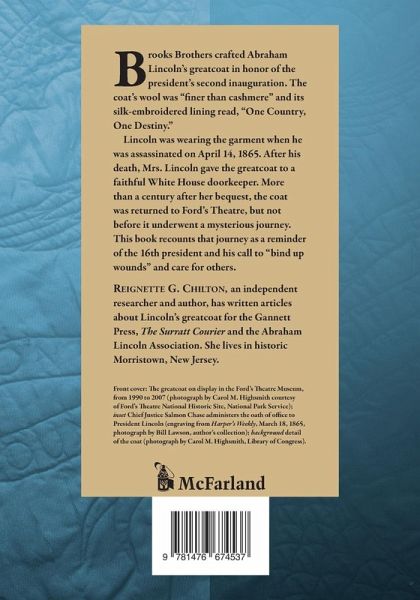 Brooks Brothers crafted Abraham Lincoln's greatcoat in honor of the president's second inauguration. The coat's wool was "finer than cashmere." Its quilted silk lining bore an embroidered banner that read, "One Country, One Destiny." Lincoln wore the garment when he was assassinated on April 14, 1865. After his death, Mrs. Lincoln gave the greatcoat to a faithful doorkeeper. The coat was returned to Ford's Theatre more than a century after her bequest, but not before it underwent a mysterious journey. This book recounts that journey as a reminder of the 16th president and his call to "bind up wounds" and care for others.