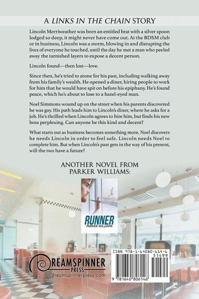 A Links In the Chain Story Lincoln Merriweather was born an entitled brat with a silver spoon lodged so deep, it might never have come out. At the BDSM club or in business, Lincoln was a storm, blowing in and disrupting the lives of everyone he touched, until the day he met a man who peeled away the tarnished layers to expose a decent person. Lincoln found-then lost-love. Since then, he's tried to atone for his past, including walking away from his family's wealth. He opened a diner, hiring people to work for him that he would have spit on before his epiphany. He's found peace, which he's about to lose to a hazel-eyed man. Noel Simmons wound up on the street when his parents discovered he was gay. His path leads him to Lincoln's diner, where he asks for a job. He's thrilled when Lincoln agrees to hire him, but finds his new boss perplexing. Can anyone be this kind and decent? What starts out as business becomes something more. Noel discovers he needs Lincoln in order to feel safe. Lincoln needs Noel to complete him. But when Lincoln's past gets in the way of his present, will the two have a future?
