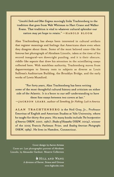 "Lincoln's Smile demonstrates why Alan Trachtenberg has been the leading scholar in American studies for more than four decades." -Casey Nelson Blake, Columbia University Alan Trachtenberg has always been interested in cultural artifacts that register meanings and feelings that Americans share even when they disagree about them. Some of the most beloved ones-like the famous last photograph of Abraham Lincoln, taken at the time of his second inaugural-are downright puzzling, and it is their obscure, riddlelike aspects that draw his attention in the scintillating essays of Lincoln's Smile and Other Enigmas . With matchless authority, Trachtenberg moves from daguerreotypes to literary texts to subjects as diverse as Louis Sullivan's Auditorium Building, the Brooklyn Bridge, and the early works of Lewis Mumford.
