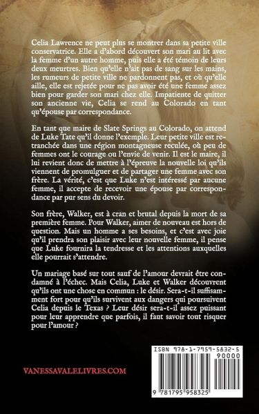Celia Lawrence ne peut plus se montrer dans sa petite ville conservatrice. Elle a d'abord découvert son mari au lit avec la femme d'un autre homme, puis elle a été témoin de leurs deux meurtres. Bien qu'elle n'ait pas de sang sur les mains, les rumeurs de petite ville ne pardonnent pas, et où qu'elle aille, elle est rejetée pour ne pas avoir été une femme assez bien pour garder son mari chez elle. Impatiente de quitter son ancienne vie, Celia se rend au Colorado en tant qu'épouse par correspondance. En tant que maire de Slate Springs au Colorado, on attend de Luke Tate qu'il donne l'exemple. Leur petite ville est retranchée dans une région montagneuse reculée, où peu de femmes ont le courage ou l'envie de venir. Il est le maire, il lui revient donc de mettre à l'épreuve la nouvelle loi qu'ils viennent de promulguer et de partager une femme avec son frère. La vérité, c'est que Luke n'est intéressé par aucune femme, il accepte de recevoir une épouse par correspondance par pur sens du devoir. Son frère, Walker, est à cran et brutal depuis la mort de sa première femme. Pour Walker, aimer de nouveau est hors de question. Mais un homme a ses besoins, et c'est avec joie qu'il prendra son plaisir avec leur nouvelle femme, il pense que Luke fournira la tendresse et les attentions auxquelles elle pourrait s'attendre. Un mariage basé sur tout sauf de l'amour devrait être condamné à l'échec. Mais Celia, Luke et Walker découvrent qu'ils ont une chose en commun : le désir. Sera-t-il suffisamment fort pour qu'ils survivent aux dangers qui poursuivent Celia depuis le Texas ? Leur désir sera-t-il assez puissant pour leur apprendre que parfois, il faut savoir tout risquer pour l'amour ?
