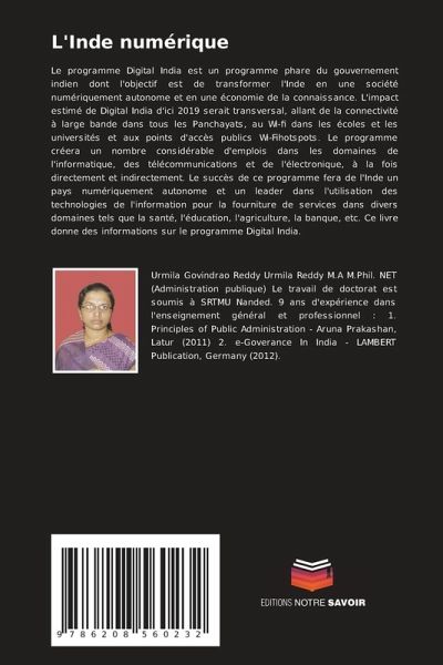 Le programme Digital India est un programme phare du gouvernement indien dont l'objectif est de transformer l'Inde en une société numériquement autonome et en une économie de la connaissance. L'impact estimé de Digital India d'ici 2019 serait transversal, allant de la connectivité à large bande dans tous les Panchayats, au Wi-fi dans les écoles et les universités et aux points d'accès publics Wi-Fihotspots. Le programme créera un nombre considérable d'emplois dans les domaines de l'informatique, des télécommunications et de l'électronique, à la fois directement et indirectement. Le succès de ce programme fera de l'Inde un pays numériquement autonome et un leader dans l'utilisation des technologies de l'information pour la fourniture de services dans divers domaines tels que la santé, l'éducation, l'agriculture, la banque, etc. Ce livre donne des informations sur le programme Digital India.