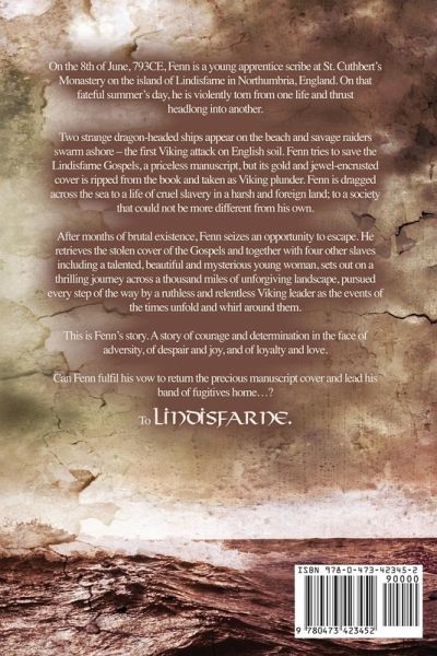 An authentic historical fiction set in England and Europe at the end of the turbulent 8th century CE. A tale of a clash of cultures; and the triumph of courage, resilience and determination over adversity. On the 8th of June, 793CE, Fenn is a young apprentice scribe at St. Cuthbert’s Monastery on the island of Lindisfarne in Northumbria, England. He is just beginning a relationship with milkmaid Yseld but on that fateful summer’s day, he is violently torn from one life and thrust headlong into another. Two strange dragon-headed ships appear on the beach and savage raiders swarm ashore – the first Viking attack on English soil. Fenn tries to save the Lindisfarne Gospels, a priceless manuscript, but its gold and jewel-encrusted cover is ripped from the book and taken as Viking plunder. Fenn and twenty others are dragged to the Viking ships, leaving the bodies of monks sprawled in the dust and the monastery in flames; the fate of Yseld unknown. The captives are taken across the wild North Sea to a life of cruel slavery in a harsh and foreign land; to a society that could not be more different from their own. After months of brutal existence, Fenn seizes an opportunity to escape. He retrieves the stolen cover of the Gospels and together with four other slaves including a talented, beautiful and mysterious young woman, sets out to cross a thousand miles of uncharted seas and unforgiving landscape, pursued every step of the way by a ruthless and relentless Viking leader as the events of the times unfold and whirl around them. This is Fenn’s story. A story of courage and hardship, of despair and joy, and of loyalty and love. Can Fenn fulfil his vow to return the precious manuscript cover and lead his band of fugitives home…? To LINDISFARNE.