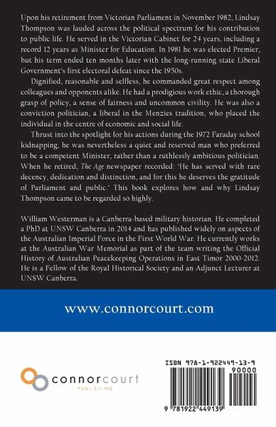 Upon his retirement from Victorian Parliament in November 1982, Lindsay Thompson was lauded across the political spectrum for his contribution to public life. He served in the Victorian Cabinet for 24 years, including a record 12 years as Minister for Education. In 1981 he was elected Premier, but his term ended ten months later with the long-running state Liberal Government's first electoral defeat since the 1950s. Dignified, reasonable and selfless, he commanded great respect among colleagues and opponents alike. He had a prodigious work ethic, a thorough grasp of policy, a sense of fairness and uncommon civility. He was also a conviction politician, a liberal in the Menzies tradition, who placed the individual in the centre of economic and social life. Thrust into the spotlight for his actions during the 1972 Faraday school kidnapping, he was nevertheless a quiet and reserved man who preferred to be a competent Minister, rather than a ruthlessly ambitious politician. When he retired, The Age newspaper recorded: 'He has served with rare decency, dedication and distinction, and for this he deserves the gratitude of Parliament and public.' This book explores how and why Lindsay Thompson came to be regarded so highly. William Westerman is a Canberra-based military historian. He completed a PhD at UNSW Canberra in 2014 and has published widely on aspects of the Australian Imperial Force in the First World War. He currently works at the Australian War Memorial as part of the team writing the Official History of Australian Peacekeeping Operations in East Timor 2000-2012. He is a Fellow of the Royal Historical Society and an Adjunct Lecturer at UNSW Canberra.