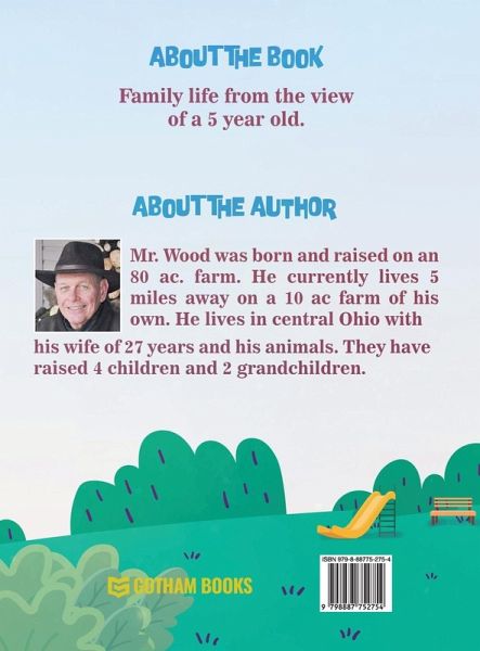 Family life from the view of a 5 yr old. About The Author Mr. Wood was born and raised on an 80 ac. farm. He currently lives 5 miles away on a 10 ac farm of his own. He lives in central Ohio with his wife of 27years and his animals. They have raised 4 children and 2 grand children.