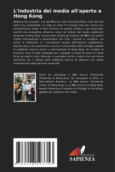 Abbiamo tre co-autori, uno dal Messico: Chiu Armando Flores e gli altri due dalla Cina continentale. Si tratta di: Chen Yi e Zhang Ying Yao. Anche loro contribuiscono molto. Il libro fornisce un quadro olistico e ben bilanciato, nonché una prospettiva dinamica unica nel settore dei media pubblicitari all'aperto di Hong Kong. Questo libro aiuterà gli studenti, gli MBA e gli uomini d'affari internazionali a comprendere non solo i concetti e i problemi, ma anche le dinamiche e i meccanismi causali dell'industria pubblicitaria. Questo libro è una panoramica concisa e accessibile delle principali aziende di pubblicità esterna (locali e internazionali) di Hong Kong. Un modello di business unico è stato sviluppato per i manager in modo da avere un modo facile da capire e ben illustrato, e permette anche a coloro che non hanno familiarità con il settore della pubblicità esterna di ottenere una rapida comprensione degli elementi essenziali.