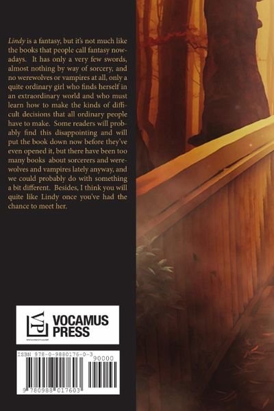 Lindy is a fantasy, but it's not much like the books that people call fantasy nowadays. It has only a very few swords, almost nothing by way of sorcery, and no werewolves or vampires at all, only a quite ordinary girl who finds herself in an extraordinary world and who must learn how to make the kinds of difficult decisions that all ordinary people have to make. Some readers will probably find this disappointing, but there have been too many books about sorcerers and werewolves and vampires lately anyway, and we could probably do with something a bit different. Besides, I think you will quite like Lindy once you've had the chance to meet her.