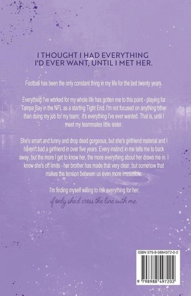 Football has been the only constant thing in my life for the last twenty years. Everything I've worked for my whole life has gotten me to this point - playing for Tampa Bay in the NFL as a starting Tight End. I'm not focused on anything other than doing my job for my team; it's everything I've ever wanted. That is, until I meet my teammates little sister. She's smart and funny and drop dead gorgeous, but she's girlfriend material and I haven't had a girlfriend in over five years. Every instinct in me tells me to back away, but the more I get to know her, the more everything about her draws me in. ¿I know she's off limits - her brother has made that very clear, but somehow that makes the tension between us even more irresistible. I'm finding myself willing to risk everything for her, if only she'd cross the line with me.