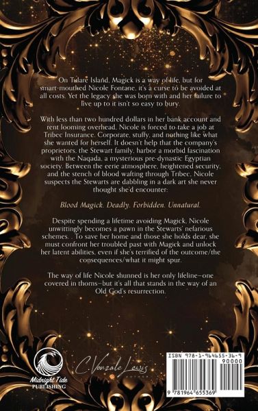 On Tulare Island, Magick is a way of life, but for smart-mouthed Nicole Fontane, it's a curse to be avoided at all costs. Yet the legacy she was born with and her failure to live up to it isn't so easy to bury. With less than two hundred dollars in her bank account and rent looming overhead, Nicole is forced to take a job at Tribec Insurance. Corporate, stuffy, and nothing like what she wanted for herself. It doesn't help that the company's proprietors, the Stewart family, harbor a morbid fascination with the Naqada, a mysterious pre-dynastic Egyptian society. Between the eerie atmosphere, heightened security, and the stench of blood wafting through Tribec, Nicole suspects the Stewarts are dabbling in a dark art she never thought she'd encounter: Blood Magick. Deadly. Forbidden. Unnatural. Despite spending a lifetime avoiding Magick, Nicole unwittingly becomes a pawn in the Stewarts' nefarious schemes. To save her home and those she holds dear, she must confront her troubled past with Magick and unlock her latent abilities, even if she's terrified of the outcome and what it might spur. The way of life Nicole shunned is her only lifeline-one covered in thorns-but it's all that stands in the way of an Old God's resurrection.