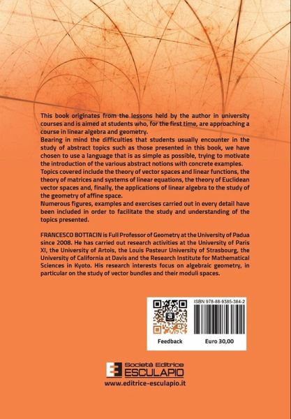 This book originates from the lessons held by the author in university courses and is aimed at students who, for the first time, are approaching a course in linear algebra and geometry. Bearing in mind the difficulties that students usually encounter in the study of abstract topics such as those presented in this book, we have chosen to use a language that is as simple as possible, trying to motivate the introduction of the various abstract notions with concrete examples. Topics covered include the theory of vector spaces and linear functions, the theory of matrices and systems of linear equations, the theory of Euclidean vector spaces and, finally, the applications of linear algebra to the study of the geometry of affine space. Numerous figures, examples and exercises carried out in every detail have been included in order to facilitate the study and understanding of the topics presented.