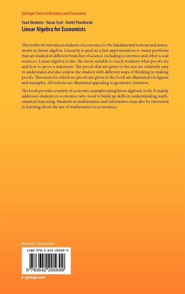 This textbook introduces students of economics to the fundamental notions and instruments in linear algebra. Linearity is used as a first approximation to many problems that are studied in different branches of science, including economics and other social sciences. Linear algebra is also the most suitable to teach students what proofs are and how to prove a statement. The proofs that are given in the text are relatively easy to understand and also endow the student with different ways of thinking in making proofs. Theorems for which no proofs are given in the book are illustrated via figures and examples. All notions are illustrated appealing to geometric intuition. The book mainly addresses students in economics who need to build up skills in understanding mathematical reasoning. Students in mathematics and informatics may be interested in learning about the use of mathematics in economics.
