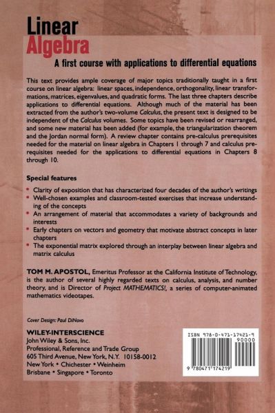 Dieses für einen breiten Leserkreis verständlich geschriebene Buch richtet sich besonders an Interessenten, die sich lange nicht mit Mathematik beschäftigt haben und nun eine grundlegende Einführung in die lineare Algebra ohne Überbetonung von Abstraktion und Formalismen suchen. Mit vielen Beispielen für die Anwendung auf Differentialgleichungen. Developed from the author's successful two-volume Calculus text this book presents Linear Algebra without emphasis on abstraction or formalization. To accommodate a variety of backgrounds, the text begins with a review of prerequisites divided into precalculus and calculus prerequisites. It continues to cover vector algebra, analytic geometry, linear spaces, determinants, linear differential equations and more.