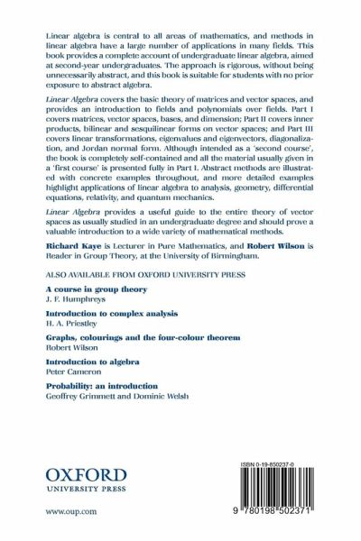 Linear Algebra provides a valuable introduction to the basic theory of matrices and vector spaces. The book covers: matrices, vector spaces, bases, and dimension; inner products, bilinear and sesquilinear forms over vector spaces; linear transformations, eigenvalues and eigenvectors, diagonalization, and Jordan normal form; and fields and polynomials over fields. Abstract methods are illustrated with concrete examples, and more detailed examples highlight applications of linear algebra to analysis, geometry, differential equations, relativity and quantum mechanics. Rigorous without being unnecessarily abstract, this useful and concise guide to the subject will be important reading for all students in mathematics and related fields.