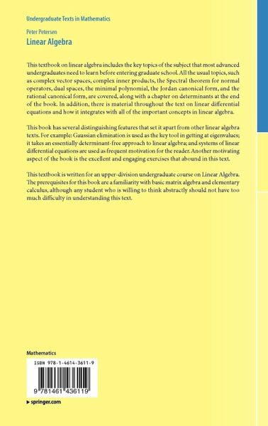 This textbook on linear algebra includes the key topics of the subject that most advanced undergraduates need to learn before entering graduate school. All the usual topics, such as complex vector spaces, complex inner products, the Spectral theorem for normal operators, dual spaces, the minimal polynomial, the Jordan canonical form, and the rational canonical form, are covered, along with a chapter on determinants at the end of the book. In addition, there is material throughout the text on linear differential equations and how it integrates with all of the important concepts in linear algebra.