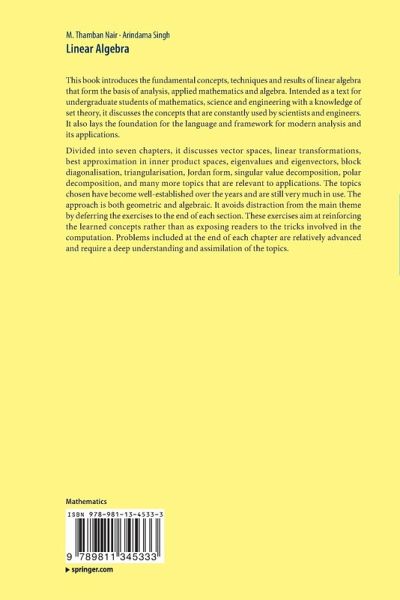 This book introduces the fundamental concepts, techniques and results of linear algebra that form the basis of analysis, applied mathematics and algebra. Intended as a text for undergraduate students of mathematics, science and engineering with a knowledge of set theory, it discusses the concepts that are constantly used by scientists and engineers. It also lays the foundation for the language and framework for modern analysis and its applications.