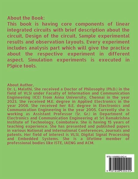 This book is having core components of linear integrated circuits with brief description about the circuit, Design of the circuit, Sample experimental results and observation layouts. Every experiment includes analysis part which will give the practice about the respective experiment in different aspect. Simulation experiments is executed in PSpice tools.