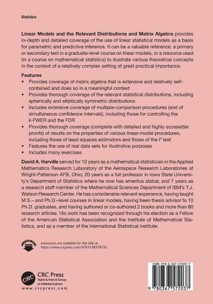 Provides coverage of matrix algebra that is extensive and relatively self-contained and does so in a meaningful contexProvides thorough coverage of the relevant statistical distributions, including spherically and elliptically symmetric distributionsIncludes extensive coverage of multiple-comparison procedures (and of simultaneous confidence intervals), including procedures for controlling the k-FWER and the FDRProvides thorough coverage (complete with detailed and highly accessible proofs) of results on the properties of various linear-model procedures, including those of least squares estimators and those of the F test.Features the use of real data sets for illustrative purposesIncludes many exercises