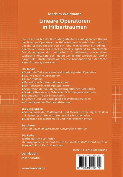 Symbolverzeichnis.- 12 Spektrale Teilräume eines selbstadjungierten Operators.- 12.1 Abstrakte Definition der spektralen Teilräume.- 12.2 Dynamische Charakterisierung der spektralen Teilräume.- 12.3 Zur Voraussetzung des RAGE-Theorems.- 13 Sturm-Liouville-Operatoren; Selbstadjungiertheit.- 13.1 Voraussetzungen; minimaler und maximaler Operator.- 13.2 Selbstadjungierte Realisierungen im regulären Fall.- 13.3 Die Weylsche Alternative; Selbstadjungierte Realisierungen im allgemeinen Fall.- 13.4 Grenzpunkt-Grenzkreisfall-Kriterien.- 13.5 Übungen.- 14 Sturm-Liouville-Operatoren; Spektraltheorie.- 14.1 Spektraldarstellung von Sturm-Liouville-Operatoren.- 14.2 Variation der Randbedingung.- 14.3 Approximation durch reguläre Probleme.- 14.4 Die Technik der Prüfertransformation.- 14.5 Absolut stetiges Spektrum.- 14.6 Übungen.- 15 Dirac-Systeme.- 15.1 Minimaler und maximaler Operator.- 15.2 Selbstadjungierte Realisierungen im regulären Fall.- 15.3 Die Weylsche Alternative; Selbstadjungierte Realisierungen im allgemeinen Fall.- 15.4 Grenzpunkt-Grenzkreisfall-Kriterien.- 15.5 Spektraldarstellung von Diracsystemen.- 15.6 Prüfertransformation für Diracsysteme.- 15.7 Absolut stetiges Spektrum.- 16 Periodische Sturm-Liouville-Operatoren und Dirac-Systeme.- 16.1 Diskriminante, Stabilitätsintervalle und Spektrum.- 16.2 Methode der direkten Integrale.- 17 Ein-Teilchen-Schrödingeroperatoren.- 17.1 Vorbemerkungen.- 17.2 Schrödingeroperatoren mit (-?)-kleinen Wechselwirkungen.- 17.3 Eigenwerte von Schrödingeroperatoren.- 17.4 Einfachheit des Grundzustandes.- 17.5 Schrödingeroperatoren mit "großen" Wechselwirkungen.- 17.6 Übungen.- 18 Separation der Variablen und Kugelflächenfunktionen.- 18.1 Zwei Separationsansätze.- 18.2 Kugelflächenfunktionen.- 18.3 Sphärischsymmetrische Schrödingeroperatoren.- 18.4 Übungen.- 19 Spektraltheorie von N-Teilchen-Schrödingeroperatoren.- 19.1 N-Teilchen-Operatoren.- 19.2 N-Teilchen-Systeme im äußeren Feld; Separation der Schwerpunktsbewegung.- 19.3 Die untere Grenze des wesentlichen Spektrums.- 19.4 Das wesentliche Spektrum von N-Teilchen-Schrödingeroperatoren.- 20 Diracoperatoren.- 20.1 Der freie Diracoperator.- 20.2 Diracoperatoren mit elektrischem Feld.- 20.3 Reduktion sphärisch symmetrischer Operatoren auf Dirac-Systeme.- 21 Grundbegriffe der Streutheorie.- 21.1 Vorbemerkungen.- 21.2 Die Wellenoperatoren.- 21.3 Streuoperator und Streumatrix.- 21.4 Übungen.- 22 Existenz der Wellenoperatoren.- 22.1 Das Cooksche Lemma.- 22.2 Existenz von W±(T2, Tl) für Differentialoperatoren Tl.- 22.3 Spurklassenmethode; der Satz von Pearson.- 22.4 Folgerungen aus dem Satz von Pearson.- 23 Ein eindimensionales Streuproblem.- 23.1 Spektraldarstellungen und Streumatrix.- 23.2 Konstruktion der Spektraldarstellung von T2.- 23.3 Die Streumatrix für ein explizit lösbares Problem.- 24 Existenz und Vollständigkeit der Wellenoperatoren nach V. Enß.- 24.1 Eigenschaften von Enß-Störungen und die Existenz der Wellenoperatoren.- 24.2 Exkurs über die Dilatationsgruppe und ihren Generator.- 24.3 Ein- und auslaufende Zustände; der Zerlegungssatz.- 24.4 Abschluß des Beweises des Satzes von Enß.- 25 Prinzipien der Mehrkanalstreuung.- 25.1 Vorüberlegungen.- 25.2 N-Teilchen-Streuung ohne äußeres Feld.- 25.3 N-Teilchen-Streuung im äußeren Feld.- Literatur.