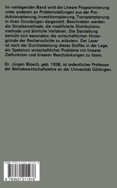 Zahlreiche VerOffentlichungen liber Lineare Optimierung (Lineare Programmierung) liegen bereits vor. Ein Teil von ihnen konzentriert sich auf die Darstellung der mathematischen Grundlagen in ausge sprochen knapper Form, ein anderer Teil diskutiert Spezialprobleme und die zugeh6rigen L6sungsans?tze, ein weiterer Teil bietet eine Einftihrung in diese Materie mit mehr oder weniger ausgepr?gtem Bezug zu betrieblichen Planungsproblemen. In die Reihe der pro blembezogenen Lehrblicher liber Lineare Optimierung reiht sich die ses Buch ein. Es versucht einerseits, verschiedene Probleme linearer Struktur zu beschreiben und andererseits einen Teil des mathemati schen Hintergrundes der L6sungsverfahren darzustellen. Es kann keine vollst?ndige Abhandlung liber die Lineare Optimie rung sein, sondem nur ein Beitrag zum Lehrangebot fUr Studieren de der Wirtschaftswissenschaften. Meinen wissenschaftlichen Mitarbeitem, Herrn Dipl.-Kfm. Dr. H. Wegener, Herrn Dipl.-Kfm. P. Haupt, Herrn Dipl.-Kfm. A.Fromm, Herm Dipl.-Kfm. L. KlingelhOfer, Herrn Dipl.-Kfm. D. Bergmann, Herrn Dipl.-Kfm. P. H6mke, Herrn cand. rer. pol. H.-J. Dix, Herrn stud. rer. pol. B.-O. Kruse danke ich sehr fUr die Unterswtzung bei der Erstellung des Manus kript~s und der Figuren, Frau M. Wimmer sei fur die Durchftihrung der Schreibarbeiten gedankt. J. Bloech G6ttingen 1973 1. Einfiihrung: Skizzen linearer Planungsprobleme Im Zuge der Entscheidungsvorbereitung und der Planerstellung be trieblicher Entscheidungstrager fallen unter den Planungsproblemen auch solche an, die eine lineare Struktur besitzen oder sich durch unerhebliche Ver?nderungen in eine lineare Struktur tiberfiihren lassen.