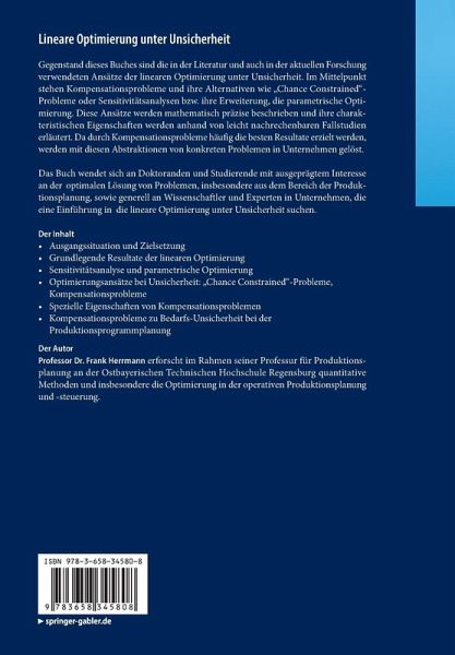 Gegenstand dieses Buches sind die in der Literatur und auch in der aktuellen Forschung verwendeten Ansätze der linearen Optimierung unter Unsicherheit. Im Mittelpunkt stehen Kompensationsprobleme und ihre Alternativen wie "Chance Constrained"-Probleme oder Sensitivitätsanalysen bzw. ihre Erweiterung, die parametrische Optimierung. Diese Ansätze werden mathematisch präzise beschrieben und ihre charakteristischen Eigenschaften werden anhand von leicht nachrechenbaren Fallstudien erläutert. Da durch Kompensationsprobleme häufig die besten Resultate erzielt werden, werden mit diesen Abstraktionen von konkreten Problemen in Unternehmen gelöst.