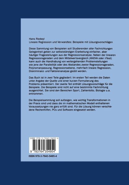 Erster Teil: Daten und Fragestellungen.- Beispiel 1: Körpergrösse von Frauen und Männern.- Beispiel 2: Höhenmessungen aus dem Siedepunkt von Wasser.- Beispiel 3: Länge von Kuckuckseiern.- Beispiel 4: Anhalteweg bei verschiedenen Geschwindigkeiten.- Beispiel 5: Körper- und Herzmasse von Katzen.- Beispiel 6: Olympische löOOm-Rennen der Männer.- Beispiel 7: Messung der Stärke sowjetischer Atomtests.- Beispiel 8: Wunschalter des Partners in Kontaktinseraten.- Beispiel 9: Körper- und Lebermasse von Mäusen.- Beispiel 10: Mittleres Einkommen von Ärzten in zwei Steuerperioden.- Beispiel 11: Erkennungsdistanz von Piloten bei verschiedenen Sichtweiten.- Beispiel 12: Körper- und Hirnmasse von Säugetieren.- Beispiel 13: Volumen von Hühnereiern.- Beispiel 14: Olympische Rekorde im Freistilschwimmen.- Beispiel 15: Schätzung der Gesamtgewinnsumme im 1. Rang.- Beispiel 16: Gezogene Zahlen der Vorwochen plus/minus eins im Schweizer Zahlenlotto.- 10.1007/978-3-0348-8897-4_17Beispiel 17: Tagesverlauf der Geburtenzahl in fünf Spitälern.- Beispiel 18: Übernommene Gewinntips der Vorwochen im Schweizer Zahlenlotto.- Beispiel 19: Engel'sches Gesetz.- Beispiel 20: Häufigkeiten der gewählten Zahlen beim Schweizer Zahlenlotto.- Beispiel 21: Weltrekorde im Schwimmen und Schnellauf.- Beispiel 22: Fläche und Einwohnerzahl der Länder der Erde.- Beispiel 23: Laufweltrekorde.- Beispiel 24: Gewinnsumme für fünf Gewinnzahlen im Jahre 1989.- Beispiel 25: Druckfestigkeit von 90 Betonziegel.- Beispiel 26: Todesfälle an Lungenentzündung.- Beispiel 27: Barometerdruck in verschiedenen Höhenlagen.- Beispiel 28: Tipphäufigkeiten im kanadischen Zahlenlotto.- Beispiel 29: Aufsichtspersonal in Industriebetrieben.- Beispiel 30: Wert von Goldmünzen.- Beispiel 31: Primzahlstatistik.-Beispiel 32: Volumen von stehenden Fichten.- Beispiel 33: Länge des Sekundenpendels.- Beispiel 34: Benzinverbrauch in den USA.- Beispiel 35: TestZiehungen im Zahlenlotto.- Beispiel 36: Schätzung und Zuschlagspreis an einer Auktion.- Beispiel 37: Methoden zur Verbesserung der Merkfähigkeit.- Beispiel 38: Häufig angekreuzte Zahlenkombinationen in zwei Wettbewerben.- Beispiel 39: Die Wirkung eines den Blutdruck senkenden Medikaments.- Beispiel 40: Weltcupabfahrt Chamonix.- Beispiel 41: Echte und gefälschte Banknoten.- Zweiter Teil: Lösungsvorschläge.- Beispiel 1: Körpergrösse von Frauen und Männern.- Beispiel 2: Höhenmessungen aus dem Siedepunkt von Wasser.- Beispiel 3: Länge von Kuckuckseiern.- Beispiel 4: Anhalteweg bei verschiedenen Geschwindigkeiten.- Beispiel 5: Körper- und Herzmasse von Katzen.- Beispiel 6: Olympische 1500m-Rennen der Männer.- Beispiel 7: Messung der Stärke sowjetischer Atomtests.- Beispiel 8: Wunschalter des Partners in Kontaktinseraten.- Beispiel 9: Körper- und Lebermasse von Mäusen.- Beispiel 10: Mittleres Einkommen von Ärzten in zwei Steuerperioden.- Beispiel 11: Erkennungsdistanz von Piloten bei verschiedenen Sichtweiten.- Beispiel 12: Körper- und Hirnmasse von Säugetieren.- Beispiel 13: Volumen von Hühnereiern.- Beispiel 14: Olympische Rekorde im Freistilschwimmen.- Beispiel 15: Schätzung der Gesamtgewinnsumme im 1. Rang.- Beispiel 16: Gezogene Zahlen der Vorwochen plus/minus eins im Schweizer Zahlenlotto.- Beispiel 17: Tagesverlauf der Geburtenzahl in fünf Spitälern.- Beispiel 18: Übernommene Gewinntips der Vorwochen im Schweizer Zahlenlotto.- Beispiel 19: Engel'sches Gesetz.- Beispiel 20: Häufigkeiten der gewählten Zahlen beim Schweizer Zahlenlotto.- Beispiel 21: Weltrekorde im Schwimmen und Schnellauf.- Beispiel22: Fläche und Einwohnerzahl der Länder der Erde.- Beispiel 23: Laufweltrekorde.- Beispiel 24: Gewinnsumme für fünf Gewinnzahlen im Jahre 1989.- Beispiel 25: Druckfestigkeit von 90 Betonziegel.- Beispiel 26: Todesfälle an Lungenentzündung.- Beispiel 27: Barometerdruck in verschiedenen Höhenlagen.- Beispiel 28: Tipphäufigkeiten im kanadischen Zahlenlotto.- Beispiel 29: Aufsichtspersonal in Industriebetrieben.- Beispiel 30: Wert von Goldmünzen.- Beispiel 31: Primzahlstatistik.- Beispiel 32: Volumen von stehenden Fichten.- Beispiel 33: Länge des Sekundenpendels.- Beispiel 34: Benzinverbrauch in den USA.- Beispiel 35: TestZiehungen im Zahlenlotto.- Beispiel 36: Schätzung und Zuschlagspreis an einer Auktion.- Beispiel 37: Methoden zur Verbesserung der Merkfähigkeit.- Beispiel 38: Häufig angekreuzte Zahlenkombinationen in zwei Wettbewerben.- Beispiel 39: Die Wirkung eines den Blutdruck senkenden Medikaments.- Beispiel 40: Weltcupabfahrt Chamonix.- Beispiel 41: Echte und gefälschte Banknoten.