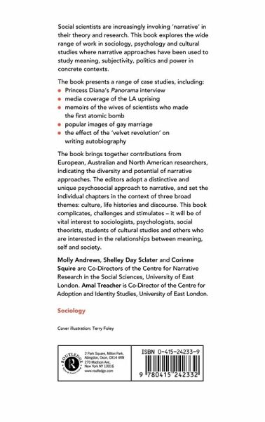 Introduction Molly Andrews Shelley Day Sclater Michael Rustin Corinne Squire Amal Treacher; Part 1 Narrative and culture; intro_1 Introduction Corinne Squire; Chapter 1 Narrative civil society and public culture Ronald N. Jacobs; Chapter 2 Resurrective practice and narrative Clive Scale; Chapter 3 Wedding bells and baby carriages Suzanna Danuta Walters; Chapter 4 Narratives as bad faith Ian Craib; Part 2 Narrative and life history; intro_2 Introduction Molly Andrews; Chapter 5 When the story's over Mark Freeman; Chapter 6 A cautious ethnography of socialism Zdenek Konopasek Molly Andrews; Chapter 7 'Papa's bomb' Carol Wolkowitz; Chapter 8 Betrayals trauma and self-redemption? Tom Wengraf; Part 3 Narrative and discourse; intro_3 Introduction Shelley Day Sclater; Chapter 9 Narrative discourse and the unconscious Wendy Hollway Tony Jefferson; Chapter 10 Fictional(ising) identity? Helen Malson; Chapter 11 'Let them rot' Marion V. Smith; Chapter 12 Narrative and the discursive (re)construction of events Jackie Abell Elizabeth H. Stokoe Michael Billig; Chapter 13 Conclusion Phil Bradbury Shelley Day Sclater;