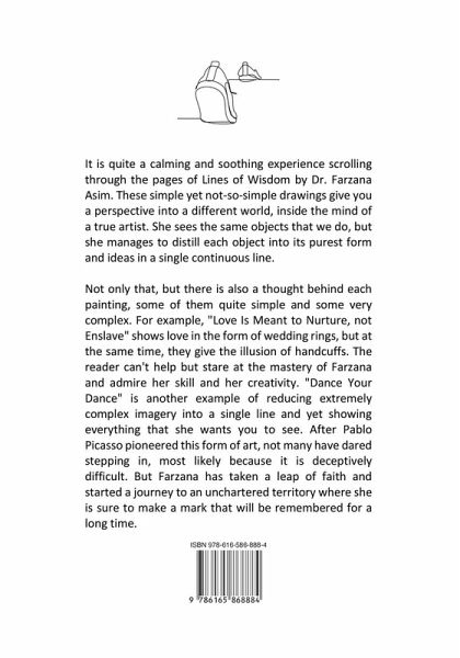 It is quite a calming and soothing experience scrolling through the pages of Lines of Wisdom by Dr. Farzana Asim. These simple yet not-so-simple drawings give you a perspective into a different world, inside the mind of a true artist. She sees the same objects that we do, but she manages to distill each object into its purest form and ideas in a single continuous line.Not only that, but there is also a thought behind each painting, some of them quite simple and some very complex. For example, "Love Is Meant to Nurture, not Enslave" shows love in the form of wedding rings, but at the same time, they give the illusion of handcuffs. The reader can't help but stare at the mastery of Farzana and admire her skill and her creativity. "Dance Your Dance" is another example of reducing extremely complex imagery into a single line and yet showing everything that she wants you to see. After Pablo Picasso pioneered this form of art, not many have dared stepping in, most likely because it is deceptively difficult. But Farzana has taken a leap of faith and started a journey to an unchartered territory where she is sure to make a mark that will be remembered for a long time.